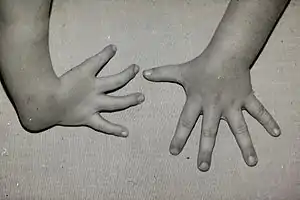 Radial dysplasia, also known as radial club hand or radial longitudinal deficiency, is a congenital difference occurring in a longitudinal direction resulting in radial deviation of the wrist and shortening of the forearm. It can occur in different ways, from a minor anomaly to complete absence of the radius, radial side of the carpal bones and thumb.[1] Hypoplasia of the distal humerus may be present as well and can lead to stiffness of the elbow.[2] Radial deviation of the wrist is caused by lack of support to the carpus, radial deviation may be reinforced if forearm muscles are functioning poorly or have abnormal insertions.[3] Although radial longitudinal deficiency is often bilateral, the extent of involvement is most often asymmetric.[1]