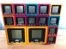 Cube World - Cube World - electronic toy featuring stick people as characters on black-and-white LCD screens, 2005 - 2008, each cube has contacts on top, bottom, and sides, 3 push buttons, and an internal motion sensor. Not to be confused with the game of the same name.