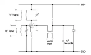 ![]() This single ended amplifier uses a narrowly tuned anode circuit to reduce harmonics when operating class AB or C. |