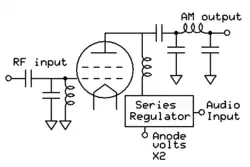 Alternatively a series regulator can be inserted between the DC supply and the anode. The DC supply provides twice the average voltage the anode sees. The regulator can allow none or all of the voltage to pass, or any intermediate value. The audio input operates the regulator in such a way as to produce the instantaneous anode voltage needed to reproduce the modulation envelope. An advantage of the series regulator is that it can set the anode voltage to any desired value. Thus the power output of the transmitter can be easily adjusted, allowing the use of dynamic carrier control. The use of PDM switching regulators makes this system very efficient, whereas the original analog regulators were very inefficient and also non linear. Series PDM modulators are used in solid state transmitters also, but the circuits are somewhat more complex, using push pull or bridge circuits for the RF section.