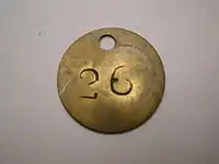 These had a slightly different use, being more of a system for ensuring the correct pay by 'checking' in and out of the workplace prior to machines being produced for this specific purpose. 'Checks' were often 'holed' for hanging on boards. In mining, for example, a number on the check was personal to each miner and prior to going down the pit, the miner would give one of his tallies to the pit head "banksman", keeping the duplicate for the duration of the shift. Upon returning to the surface, the miner gave his personal tally to the banksman who would pass it on to the time office or the lamp room. This system made it possible to keep track on workers' whereabouts in the mine complex and for what periods they were working.[5]