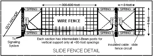 Another type of slide fence is similar except that the wires do not have to break and is easier to maintain and reset. The slide fence consists of a series of fence sections, as shown in the SLIDE FENCE DETAIL drawing (pictured right), which shows a typical installation. Each fence section is held in place by strong springs. At each end of a fence section is an electro-mechanical plug. The plugs maintain a complete electrical circuit that is monitored by signaling equipment. In normal operation, the current through the plugs causes a relay to energize, indicating that the fence is in place. When a rock slide occurs, the fence moves laterally, causing the plug to be removed, breaking the circuit. This causes the relay to become de-energized, indicating that a rock slide has occurred. A contact of the relay is typically used to prevent the approaching signal from displaying a proceed aspect if the fence has been broken.[3] Restoring normal operation requires re-inserting the plugs that were dislodged by the slide.