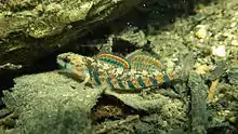 The rainbow darter (Etheostoma caeruleum) is a small species of freshwater ray-finned fish, a darter from the subfamily Etheostomatinae, part of the family Percidae, which also contains the perches, ruffes and pikeperches. It is native to North America where it is found in small, fast-moving streams and small to medium-sized rivers. It grows to 2 to 3 inches (51 to 76 mm) in length.[1] The species is very sensitive to pollution and silt, staying in clean, pollution-free water. The rainbow darter is easily identified by three dark spots on the back, and blue and orange in the dorsal and anal fins.
