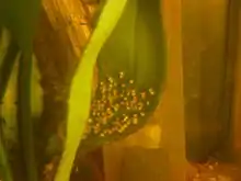 Once sex mature, the fish form monogamous pairs prior to spawning, and the males do not tolerate other males.[7] The species is known to lay its small 0.9 - 1.5 mm, adhesive eggs on flattened stones[7][12][13] or directly into small depressions dug in the gravel.[5] Like many cichlids, M. ramirezi practices biparental brood care, with both the male and the female playing roles in egg-tending and territorial defense.[5][7] Typical clutch size for the species is 150-300 eggs,[5][6] though clutches up to 500 have been reported.[12] Parental ram cichlids have been observed to fan water over their eggs, which hatch in 40 hours at 29 °C (84 °F).
