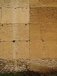 Evidence of ancient use of rammed earth has been found in Neolithic archaeological sites such as those of the Fertile Crescent, dating to the 9th–7th millennium BC,[10] and of the Yangshao and Longshan cultures in China, dating to 5000 BCE. By 2000 BCE, rammed-earth architectural techniques (夯土 Hāng tǔ) were commonly used for walls and foundations in China.[11]