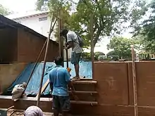 The construction of an entire wall begins with a temporary frame, the "formwork", which is usually made of wood or plywood, as a mold for the desired shape and dimensions of each section of wall. The form must be durable and well braced, and the two opposing faces must be clamped together to prevent bulging or deformation caused by the large compressing forces. Formwork plays an important role in building rammed earth walls. Historically, wooden planks tied using rope were used to build walls. Modern builders use plywood and/or steel to build formwork.
