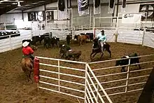 Ranch sorting is a western-style equestrian sport that evolved from the common ranch work of separating cattle into pens for branding, doctoring, or transport. Ranch Sorting is an event that pits a team of two riders on horseback against the clock. Teamwork is the key with both riders working in harmony to cut out the correct cattle and drive them to the pen while keeping the wrong numbered cattle back. There are several variations of ranch sorting with one, two or three riders on the team, but all require sorting the cattle from one pen to the other in the correct order.[2]