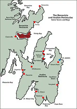 Random Island is an island located off Canada's Atlantic coast. Part of the Province of Newfoundland and Labrador, it is located on the east coast of Newfoundland and partially surrounded by the Bonavista Peninsula on the north and within the confines of Trinity Bay. The island is approximately 35 km (22 mi) long, its width varies from 15 km (9.3 mi) on the eastern end, to 6 km (3.7 mi) in the middle, to 17 km (11 mi) on the western end, with a total area of around 310 km2 (120 sq mi).[3] According to the 2016 census, the population of the island is 1,232.[4]
