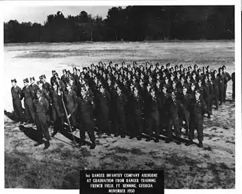 Ranger Training had begun in September 1950 at Fort Benning Georgia "with the formation and training of 17 Airborne Companies by the Ranger Training Command".[7] The first class graduated from Ranger training in November 1950, becoming the 1st Ranger Infantry Company.[8] The United States Army's Infantry School officially established the Ranger Department in December 1951. Under the Ranger Department, the first Ranger School Class was conducted in January–March 1952, with a graduation date of 1 March 1952. Its duration was 59 days.[9] At the time, Ranger training was voluntary.