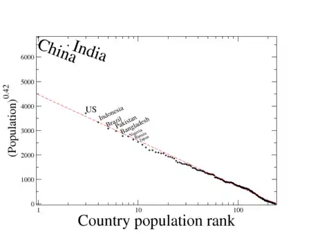 All are real-world observations that follow power laws, such as Zipf's law, the Yule distribution, or the Pareto distribution. If one ranks the population size of cities in a given country or in the entire world and calculates the natural logarithm of the rank and of the city population, the resulting graph will show a log-linear pattern. This is the rank-size distribution.[9]