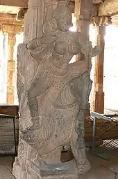 Rati (Sanskrit: रति, Rati) is the Hindu goddess of love, carnal desire, lust, passion, and sexual pleasure.[2][3][4][5] Usually described as the daughter of Prajapati Daksha, Rati is the female counterpart, the chief consort and the assistant of Kama (Kamadeva), the god of love. A constant companion of Kama, she is often depicted with him in legend and temple sculpture. She also enjoys worship along with Kama.