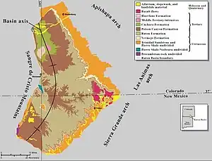 The sedimentary beds that form the basin are of Paleozoic, Mesozoic and Paleogene age. In the eastern part of the basin, the sedimentary section is capped by flows of basalt of Miocene age.[1] The basin is highly asymmetrical, the beds dipping more steeply on the west side than the east.