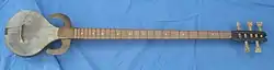 The body of the instrument is a constructed box, a bowl (like the Neapolitan mandolin or the lute), or else the neck and bowl are carved from a single piece of mulberry wood. It is used to accompany songs, and is less common with larger instrumentation. Instead of a wooden soundboard, the opening across the top of the bowl has a dried snakeskin stretched across like on a banjo; alternatively, the hide of a donkey or sheep is used. It is strung with between three and nine strings, which run across the skin membrane on the bottom, up the long fretboard and connect to a pegbox, curved backward 180 degrees. Only some strings are struck with a plectrum. The rest are sympathetic strings, vibrating in reaction to the actively played strings. Something that sets this instrument apart visually are lateral extension above the wooden bowl, decorated goat horns mounted on the neck, curving toward the bowl. The neck is inlaid decorated. While the fingerboard is not fretted, photos of the instruments show that some instruments do have strings tied around the neck in the position of frets.