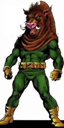 During the Hunted storyline, Razorback is among the animal-themed characters that were captured by Taskmaster and Black Ant for Kraven the Hunter's Great Hunt which is sponsored by Arcade's company Arcade Industries. He was seen at a gathering held by Vulture.[12] When the Great Hunt was over, Razorback was present when Human Fly, Toad, White Rabbit, and Yellowjacket planned to take revenge on Black Ant only for Taskmaster to make off with Black Ant.[13]