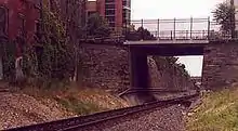 For two blocks north of Penn Street, the tracks descended beneath the streets into a deep cut, flanked on both the right and left by 20-or-30-foot (6.1 or 9.1 m) tall stone walls running through the heart of the city. As the 350 men of the 4th marched in the dark through the cut to the quiet tapping of drums, they were pelted by a large number of stones from the crowd overlooking them.[21][lower-alpha 6]