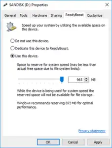 When a compatible device is plugged in, the Windows AutoPlay dialog offers an additional option to use the flash drive to speed up the system; an additional ReadyBoost tab is added to the drive's properties dialog where the amount of space to be used can be configured.[4] The minimum cache size is 250 MB. In Vista or with FAT32 formatting of the drive, the maximum is 4 GB. In Windows 7 or later with NTFS or exFAT formatting, the maximum cache size is 32 GB per device. Windows Vista allows only one device to be used, while Windows 7 allows multiple caches, one per device, up to a total of 256 GB.[5]