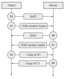 After establishing a TCP connection, an RTMP connection is established first, performing a handshake through the exchange of three packets from each side (also referred to as Chunks in the official documentation). These are referred in the official spec as C0-2 for the client sent packets and S0-2 for the server side respectively and are not to be confused with RTMP packets that can be exchanged only after the handshake is complete. These packets have a structure of their own and C1 contains a field setting the "epoch" timestamp, but since this can be set to zero, as is done in third party implementations, the packet can be simplified. The client initialises the connection by sending the C0 packet with a constant value of 0x03 representing the current protocol version. It follows straight with C1 without waiting for S0 to be received first which contains 1536 bytes, with the first four representing the epoch timestamp, the second four all being 0, and the rest being random (and which can be set to 0 in third party implementations). C2 and S2 are an echo of S1 and C1 respectively, except with the second four bytes being the time the respective message was received (instead of 0). After C2 and S2 are received, the handshake is considered complete.