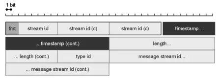 Packets are sent over a TCP connection, which is established first between client and server. They contain a header and a body which, in the case of connection and control commands, is encoded using the Action Message Format (AMF). The header is split into the Basic Header (shown as detached from the rest, in the diagram) and Chunk Message Header. The Basic Header is the only constant part of the packet and is usually composed of a single composite byte, where the two most significant bits are the Chunk Type (fmt in the specification) and the rest form the Stream ID. Depending on the value of the former, some fields of the Message Header can be omitted, and their value derived from previous packets while depending on the value of the latter, the Basic Header can be extended with one or two extra bytes (as in the case of the diagramme that has three bytes in total (c)). If the value of the remaining six bits of the Basic Header (BH) (least significant) is 0 then the BH is two bytes and represents from Stream ID 64 to 319 (64+255); if the value is 1, then the BH is three bytes (with last two bytes encoded as 16bit Little Endian) and represents from Stream ID 64 to 65599 (64+65535); if the value is 2, then BH is one byte and is reserved for low-level protocol control messages and commands. The Chunk Message Header contains meta-data information such as the message size (measured in bytes), the Timestamp Delta and Message Type. This last value is a single byte and defines whether the packet is an audio, video, command or "low level" RTMP packet such as an RTMP Ping.