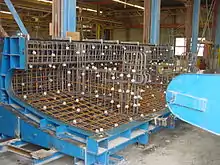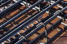 A rebar spacer is a device that secures the reinforcing steel or "rebar" in reinforced concrete structures as the rebar is assembled in place before the final concrete pour.[1] The spacers are left in place for the pour to keep the reinforcing in place. After the pour, the spacers become a part of the structure.
