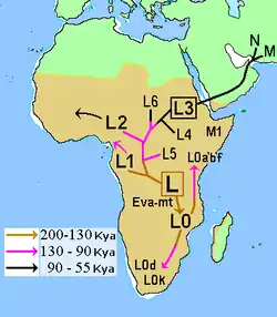 The first lineage to branch off from Mitochondrial Eve was L0. This haplogroup is found in high proportions among the San of Southern Africa and the Sandawe of East Africa. It is also found among the Mbuti people.[94][95] These groups branched off early in human history and have remained relatively genetically isolated since then. Haplogroups L1, L2 and L3 are descendants of L1–L6, and are largely confined to Africa. The macro haplogroups M and N, which are the lineages of the rest of the world outside Africa, descend from L3. L3 is about 70,000 years old, while haplogroups M and N are about 65–55,000 years old.[96][64] The relationship between such gene trees and demographic history is still debated when applied to dispersals.[97]