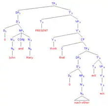 As we can see in the X-bar theory tree diagram of (6b), the reciprocal pronoun is in the subject position of the embedded clause, which is introduced by complementizer "that". It is not possible for a reflexive pronoun to occur in this position as shown by the ungrammaticality of (6a).