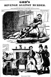 Plays were being performed while Corder was still awaiting trial, and an anonymous author published a melodramatic version of the murder after the execution, a precursor of the Newgate novels which quickly became best-sellers. The Red Barn Murder was a popular subject, along with the story of Jack Sheppard and other highwaymen, thieves and murderers, for penny gaffs, cheap plays performed in the back rooms of public houses.[28] James Catnach sold more than a million broadsides[29][c] (sensationalist single sheet newspapers) which gave details of Corder's confession and execution, and included a sentimental ballad supposedly written by Corder himself (though more likely to have been the work of Catnach or somebody in his employ).[30][31][32] It was one of at least five ballads about the crime that appeared directly following the execution.[33]