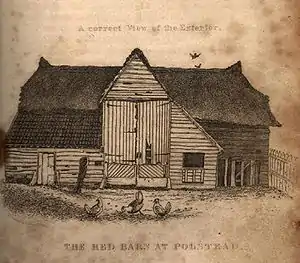 Pieces of the rope which was used to hang Corder sold for a guinea each. Part of his scalp with an ear still attached was displayed in a shop on Oxford Street.[35] A lock of Marten's hair sold for two guineas. Polstead became a tourist venue, with visitors travelling from as far afield as Ireland;[36] Curtis estimated that 200,000 people visited Polstead in 1828 alone.[4] The Red Barn and the Martens' cottage excited particular interest.[36] The barn was stripped for souvenirs, down to the planks being removed from the sides, broken up, and sold as toothpicks.[37] It was slated to be demolished after the trial, but it was left standing and eventually burned down in 1842.[4][d] Even Marten's gravestone in the churchyard of St Mary's, Polstead, was eventually chipped away to nothing by souvenir hunters; only a sign on the shed now marks the approximate place where it stood,[38] although her name is given to Marten's Lane in the village. Pottery models and sketches were sold and songs were composed, including one quoted in the Vaughan Williams opera Hugh the Drover and Five Variants of Dives and Lazarus.