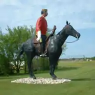 Sir John A. Macdonald read the bill to create the North-West Mounted Police in 1873, which was passed in May of that year. Recruitment of men for the police force began in September 1873 and they assembled at Fort Dufferin, Manitoba.[nb 4] The border between the United States and Canada was surveyed in 1872.[54] On July 8, 1874, these trained men were despatched on their western journey.[54][55] There is a museum and the 1884 NWMP Barracks Site at Fort Macleod which preserves the NWMP history at the Fort, supplemented by a RCMP musical ride which is held yearly in commemoration.[6] Healy and Hamilton built Fort Whoop Up 8 mi (13 km) from the current location of Lethbridge near the confluence of the St. Mary and Belly Rivers. Today the location of Fort Whoop Up is signified by a historical cairn marker. Colonel Macleod of the Royal Northwest Mounted Police (RNWMP) presented Healy and Hamilton with an offer to purchase Fort Whoop Up which they declined.[nb 5][57] RNWMP were established at Coal Banks in 1885 forming K Division under the command of Superintendent A.R. McDonnell. This site in the Porcupine Hills was the coal mining site of Lethbridge.[58] The Red Coats of 1874 had the option to settle on ranches following their three-year term with the RNWMP.[39] Grasslands National Park near Ponteix, Sk features NWMP trail markers amidst the Killdeer Badlands.[59][60] Wood Mountain Post was established in 1874 to reduce cattle rustling, whisky trading, which was completed post haste, and the NWMP post closed in 1875. Following his victory against the U.S. cavalry in the 1876 Battle of the Little Bighorn, Sitting Bull and about 5,000 of his followers sought sanctuary in the Wood Mountain, Sk area.[61] Superintendent James Walsh from Fort Walsh left the Cypress Hills area to talk to Sitting Bull. 22 NWMP police officer accompanied by Walsh set up a new Wood Mountain detachment, Walsh remained here with the men until his transfer to Fort Qu'Appelle in 1880.[62] The Hudson's Bay Trading Post site was replaced with Chapel Coulee, Metis village of Chapel Coulee, which was later where the NWMP established a post in 1879 and small detachment from Fort Walsh. In 1887, the detachment moved to the banks of the White Mud River the current location of Eastend, Sk as many of their concernts were alleviated, the whisky trade had ceased, the North-West Rebellion of 1885 was over, and Sitting Bull, a Hunkpapa Lakota Sioux holy man surrendered to American forces and returned to the United States in 1881.[nb 6][18] The town of Redvers, SK, along the Red Coat Trail, is named after General Sir Redvers Henry Buller VC GCB GCMG (1839–1908).[63][64][65][66] The Boundary Commission Trail is an earlier route used from Winnipeg for travel east.[67][68]