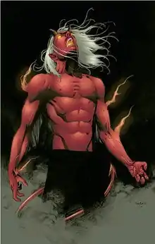 After the events of Infinite Crisis and 52, Eddie has a demonic appearance and inherent abilities, both granted to him by the demon-lord Neron. His new form gives him a capacity to breathe fire, enhanced strength and endurance, and an ability to heal from non-fatal wounds ten times faster than a human. When punched in the stomach, Eddie cannot control his fire breath. Eddie's blood is now a thick gasoline-smelling liquid, his breath is hotter than fire, his own skin is able to cause burns (being at 200 degrees) and he has been seen to be able to increase this, to the point of his skin turning white hot. He can fire streams of flame from his hands, has retractable wings underneath his arms that help him glide, possesses a prehensile tail, and his internal temperature is 600°. He learned how to create portals of fire through which he can travel long distances.