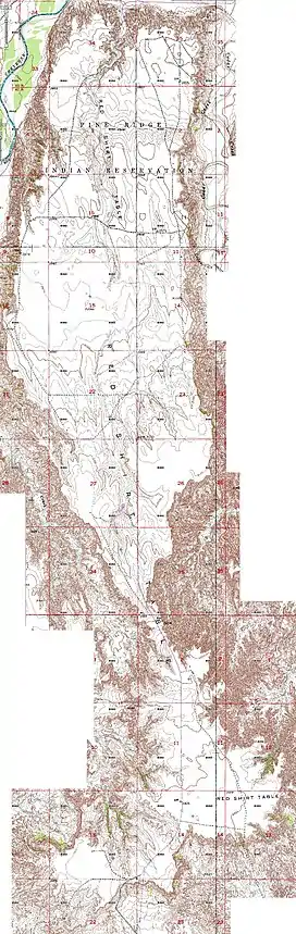 Red Shirt Table is a table mountain in Oglala Lakota County, South Dakota part of the Pine Ridge Indian Reservation of the Oglala Sioux Tribe. The table, named after Chief Red Shirt is approximately 10 miles (16 km) long, generally extending in a north–south direction, and is located along the western boundary of Badlands National Park's Stronghold Unit. The park's highest point is located at the southern end of the table at 3,340 feet (1,020 m).[1] The irregularly shaped southern portion of the table is connected to the more rectangular northern portion by a narrow section less than 800 feet (240 m) wide; the northern portion is up to two miles (3 km) wide and is composed of two elongated lobes with a runoff channel between them. The top surface of the table slopes gently downhill as it extends northward, with the north edge being at about 2,800' in elevation. It drops off steeply from almost all sides, up to 300'. French Creek flows to the northeast, and the intermittent Cedar Creek drains the entire east side of the table.
