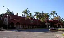 The Pacific Electric Railway (PE) completed an interurban connection between Los Angeles and San Bernardino in 1914, providing a convenient, speedy connection to the fast-growing city of Los Angeles and its new port at San Pedro, bringing greater prosperity to the town and a new role as a vacation destination for wealthy Angelenos. Redlands was the eastern terminus of the "Big Red Car" system. At its peak, PE operated five local routes in Redlands, with streetcars running to Smiley Heights and on Orange, Olive, and Citrus Avenues.[25] Pacific Electric's interurban service to Redlands was abandoned on July 20, 1936, with 2.07 miles (3.33 km) of track into the city lifted,[26] although PE and Southern Pacific (parent company of PE) provided freight service as far as the Sunkist packing plant at Redlands Heights on San Bernardino Avenue[27] into at least the 1970s. The Smiley Heights line was abandoned at this time, as well. Bus service operated by the Motor Transit Company, a subsidiary of Pacific Electric, began on July 20.[28] This also affected mail delivery in Redlands as "Approximately 80 percent of our mail from all directions arrives on the 5 a.m. electric car," explained Postmaster James B. Stone. "This dispatch is sorted and morning deliveries started by 8:30 a.m. on most routes. The post office department has temporarily arranged for this mail to be brought in by the Santa Fe train at 6:05 a.m. As this arrival is an hour later, our service will be one hour later."[29] The abandoned Pacific Electric La Quinta trestle over the Santa Ana River stood immediately south of San Bernardino International Airport into the 2010s but was removed when an Amazon facility was built adjacent to the site.