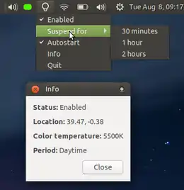 redshift-gtk is included in Redshift's source tree. In addition to a windowed interface, it provides a tray status icon that can enable or disable Redshift or adjust the screen's color temperature automatically.