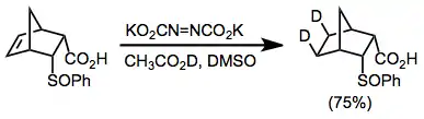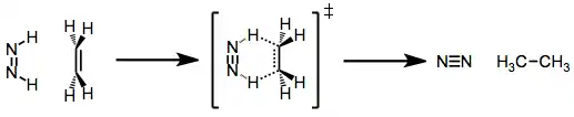 Diimide is typically generated either through the oxidation of hydrazine or the decarboxylation of potassium azodicarboxylate. Kinetic experiments suggest that regardless of its method of generation, the formation of diimide is rate-limiting. The transition state of the hydrogen transfer step is likely early; however, high stereoselectivity has been obtained in many reductions of chiral alkenes.[6]
