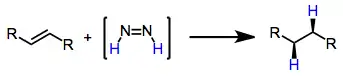 In 1929, the conversion of oleic acid to stearic acid in the presence of hydrazine was observed.[2] The short-lived intermediate diimide was not implicated in this reductive process until the 1960s. Since that time, several methods of generating transient amounts of diimide have been developed.[3][4] In the presence of unpolarized alkenes, alkynes or allenes, diimide is converted into dinitrogen with reduction (net addition of dihydrogen) of the unsaturated functionality. Diimide formation is the rate-limiting step of the process, and a concerted mechanism involving cis-diimide has been proposed.[5] This reduction represents a metal-free alternative to catalytic hydrogenation reductions, and does not lead to the cleavage of sensitive O–O and N–O bonds.