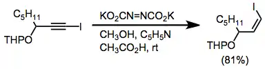 Iodoalkynes represent an exception to the rule that alkenes cannot be obtained from alkynes. After diimide reduction of iodoalkynes, cis-iodoalkenes may be isolated in good yield.[9]
