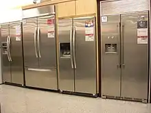 Display of modern American-style / side-by-side refrigerators, available for purchase in a store