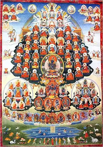 A key function of a Refuge Tree painting is to depict the transmission lineage of the particular sect or tradition. As David P. Jackson & Janice Jackson stated in Tibetan Thangka Painting, "For the religious practitioner these paintings embodied the whole lineage through which the tradition descended, from its ultimate origin down to the practitioner's own teacher".[2] The Jacksons go on to explain that the practitioner imagines the main central figure of the Refuge Tree (the identity of which depends on the particular tradition) as the essence of one's main teacher or Root Lama.[2]