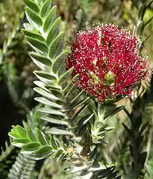 Regelia velutina, the Barrens regelia,[2] is a species of flowering plant in the myrtle family Myrtaceae. It is endemic to the south-west of Western Australia. It is a large shrub with greyish green, velvety leaves and large clusters of brilliant red to orange flowers on the ends of its branches in spring and summer.