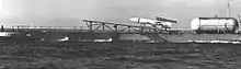 The Regulus missile itself was 30 ft (9.1 m) long, 4 ft (1.2 m) in diameter, had a wingspan of 10 ft (3.0 m), and weighed between 10,000 and 12,000lb (4,500 and 5,400 kg).[1] Guidance was provided by remote control, with at least two control stations required for operation of the weapon, which could be installed on submarines, ships or chase aircraft.[3] The first Regulus launch took place in March 1951, using a specially converted test missile fitted with an undercarriage to allow for easy recovery.[4] At the same time, the Navy began consideration of the use of submarines armed with cruise missiles, and in 1953 recommissioned a World War II vintage Gato-class submarine, USS Tunny, for conversion into its first cruise missile submarine.[5] Tunny was initially employed as a more advanced testbed for the use of cruise missiles from submarines than the previous boats, Carbonero and Cusk, as she was fitted with a specially designed missile hangar located aft of her sail. This pressurised, watertight installation allowed Tunny to be able to submerge with the missiles on board, and was connected via an access trunk to the boat itself, allowing the missiles to be prepared while the submarine was still under water.[6]