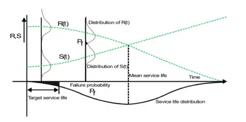 The performance-based service life model proposed by the European project DuraCrete,[8] and by FIB Model Code for Service Life Design,[9] is based on a probabilistic approach, similar to the one adopted for structural design. Environmental factors are considered as loads S(t), while material properties such as chloride penetration resistance are considered as resistances R(t) as shown in Figure 2. For each degradation process, design equations are set to evaluate the probability of failure of predefined performances of the structure, where acceptable probability is selected on the basis of the limit state considered. The degradation processes are still described with the models previously defined for carbonation-induced and chloride-induced corrosion, but to reflect the statistical nature of the problem, the variables are considered as probability distribution curves over time.[4] To assess some of the durability design parameters, the use of accelerated laboratory test is suggested, such as the so called Rapid Chloride Migration Test to evaluate chloride penetration resistance of concrete [9]'. Through the application of corrective parameters, the long-term behaviour of the structure in real exposure conditions may be evaluated.