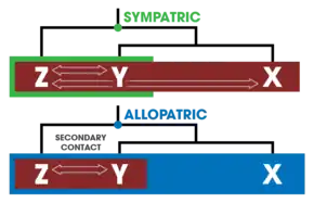 It is possible that the process of sympatric speciation itself may result in the observed patterns of reinforcement.[3]: 378 One method of distinguishing between the two is to construct a phylogenetic history of the species, as the strength of prezygotic isolation between a group of related species should differ according to how they speciated in the past.[45] Two other ways to determine if reinforcement occurs (as opposed to sympatric speciation) are: