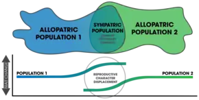 After speciation by reinforcement occurs, changes after complete reproductive isolation (and further isolation thereafter) are a form of reproductive character displacement.[23] A common signature of reinforcement's occurrence in nature is that of reproductive character displacement; characteristics of a population diverge in sympatry but not allopatry.[6][5] One difficulty in detection is that ecological character displacement can result in the same patterns.[24] Further, gene flow can diminish the isolation found in sympatric populations.[24] Two important factors in the outcome of the process rely on: 1) the specific mechanisms that causes prezygotic isolation, and 2) the number of alleles altered by mutations affecting mate choice.[25]