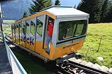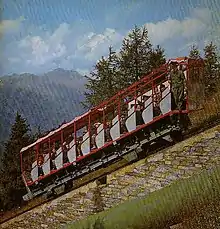 Each section of the line is worked by coaches with 64 seats that are hauled by 40-millimetre-thick cables from their upper stations. The diameter of the electrically driven cable drums is 3.85 metres. The gradient of the line varies between 25 and 82%.