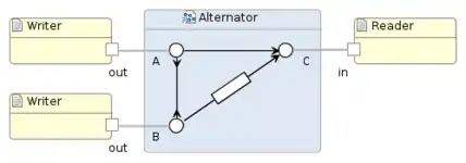 The figure on the top-right shows an example of a producers-consumer system with three components: two producers on the left and one consumer on the right. The circuit in the middle defines the protocol, which states that the producers should send data synchronously, while the consumer receives those data in alternating order.