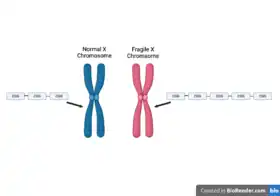 Fragile X syndrome is caused by the expansion of the DNA sequence CCG in the FMR1 gene on the X chromosome.[34] This gene produces the RNA-binding protein FMRP. In the case of Fragile X syndrome the repeated sequence makes the gene unstable and therefore silences the gene FMR1.[35] Because the gene resides on the X chromosome, females who have two X chromosomes are less effected than males who only have on X chromosome and one Y chromosome because the second X chromosome can compensate for the silencing of the gene on the other X chromosome.