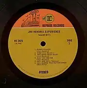 "Two-tone orange" label used by Reprise during the Warner Bros.-Seven Arts merger from 1968 to 1969. (Label to Jimi Hendrix's Smash Hits.) After the Kinney National Company took over Warner Bros. in 1969, the orange tone at the top of the label was changed to the same tone as on the rest of the label, the W7 box logo was removed and the circled :r logo (an artistic representation of a repeat symbol in music notation) became a boxed logo without the "Reprise" designation.