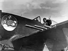P-47 pilots frequently carried two 500 lb (230 kg) bombs, using skip bombing techniques for difficult targets (skipping bombs into railroad tunnels to destroy hidden enemy trains was a favorite tactic).[47] The adoption of the triple-tube M10 rocket launcher[48] with M8 high-explosive 4.5 in (110 mm) rockets (each with an explosive force similar to a 105 mm artillery shell)—much as the RAF's Hawker Typhoon gained when first fitted with its own two quartets of underwing RP-3 rockets for the same purposes—significantly increased the P-47's ground attack capability.[49] Late in the war, the P-47 was retrofitted with more powerful 5 in (130 mm) HVAR rockets.