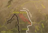 The Republic of Upper Volta (French: République de Haute-Volta) was a landlocked West African country established on 11 December 1958 as a self-governing colony within the French Community.[1][2] Before becoming autonomous, it had been part of the French Union as the French Upper Volta. On 5 August 1960, it gained full independence from France.[3] On 4 August 1984, it changed its name to Burkina Faso.