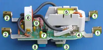 In the internal mechanism of an RCD, the incoming supply and the neutral conductors are connected to the terminals at (1), and the outgoing load conductors are connected to the terminals at (2). The earth conductor (not shown) is connected through from supply to load uninterrupted. When the reset button (3) is pressed, the contacts ((4) and another, hidden behind (5)) close, allowing current to pass. The solenoid (5) keeps the contacts closed when the reset button is released.