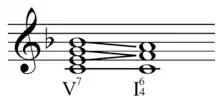 An example of a single dissonant note which requires resolution would be, for instance, an F during a C major chord, C–E–G, which creates a dissonance with both E and G and may resolve to either, though more usually to E (the closer pitch). This is an example of a suspended chord. In reference to chords and progressions for example, a phrase ending with the following cadence IV–V, a half cadence, does not have a high degree of resolution. However, if this cadence were changed to (IV–)V–I, an authentic cadence, it would resolve much more strongly by ending on the tonic I chord.